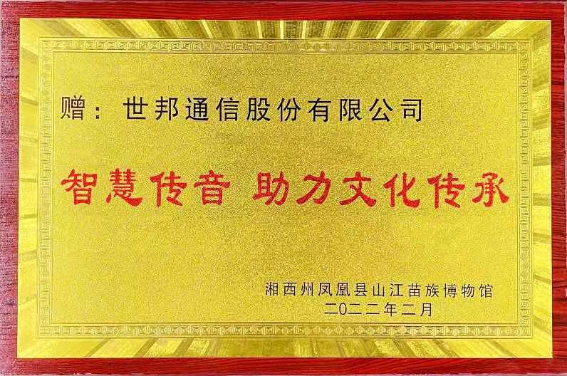 近日,世邦收到了來自湘西州鳳凰縣山江苗族博物館、湘西州花垣縣抗日革屯博物館送來的感謝牌匾,感謝世邦為地方博物館的建設(shè)無償捐贈智能廣播安防設(shè)備。通過世邦“人工智能”安防系統(tǒng)的部署,大力提升了博物館治安防控能力,助力民族文化的傳承與保護。