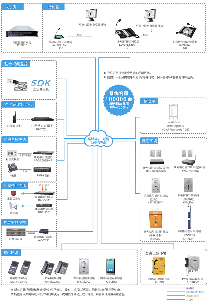 世邦I(lǐng)P網(wǎng)絡(luò)內(nèi)部通訊對(duì)講系統(tǒng)采用XCoIP®技術(shù), 將音頻信號(hào)以數(shù)據(jù)包形式在局域網(wǎng)和廣域網(wǎng)上進(jìn)行傳送,是一套純數(shù)字傳輸?shù)拿馓釋?duì)講系統(tǒng)。解決了傳統(tǒng)對(duì)講系統(tǒng)存在的傳輸距離有限、易受干擾等問(wèn)題。該系統(tǒng)結(jié)構(gòu)清晰, 只需將終端接入計(jì)算機(jī)網(wǎng)絡(luò)即可構(gòu)成功能強(qiáng)大的數(shù)字化通訊系統(tǒng),每個(gè)接入點(diǎn)無(wú)需單獨(dú)布線,實(shí)現(xiàn)計(jì)算機(jī)網(wǎng)絡(luò)、數(shù)字視頻監(jiān)控、內(nèi)部通訊的多網(wǎng)合一。