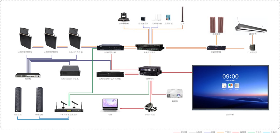 中控矩陣系統(tǒng)為智能多媒體會議室系統(tǒng)設(shè)計靈魂,集中了燈光、機械、投影及視音頻控制手段于一體,為使用者提供簡單、直接的控制界面,令使用者能方便地掌握整個空間環(huán)境各設(shè)備的狀態(tài)及功能。中控系統(tǒng)采用平板電腦進(jìn)行操作,根據(jù)會議室的時間使用情況,編輯運行控制程序,下載到中控主機和平板電腦進(jìn)行控制運行,達(dá)到音視頻切換實時操控,解決繁瑣操作。