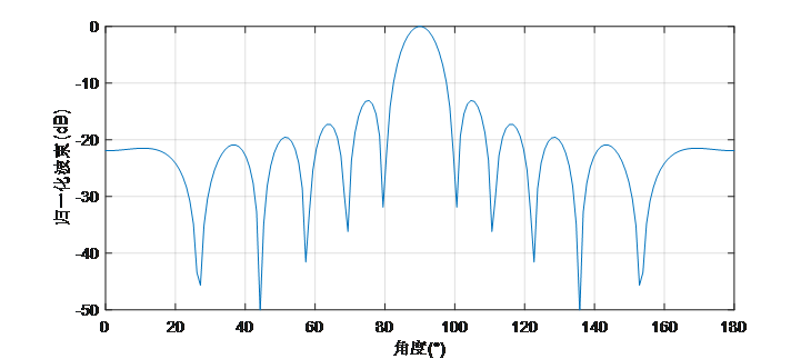 上面給出了一個(gè)波束圖示例,這是一個(gè)由12個(gè)麥克風(fēng)組成的均勻線性陣列,陣列間距d=8cm,聲源入射角度為陣列側(cè)邊正前方(即90°的位置),聲源頻率f=2000Hz。上圖共包括11個(gè)波束,具有大幅度的波束稱為主瓣(聲源所在方向),其他都是旁瓣。主瓣寬度定義為主瓣兩邊的兩個(gè)第一過(guò)零點(diǎn)之間的范圍,上圖的主瓣寬度大約是20°。旁瓣增益指的是大的旁瓣高度,上圖的旁瓣增益大約是-12dB。