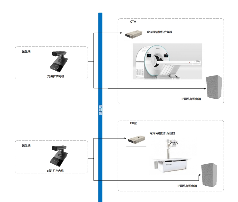 核磁醫(yī)檢對講擴聲系統(tǒng)可在高噪聲環(huán)境下使用,具備全雙工對講、主動降噪等功能,在核磁醫(yī)檢場景下,可滿足醫(yī)生和患者之間的正常通話交流需求。目前在國內(nèi)多家醫(yī)院的放射科室(CT室、DR室)有應用。